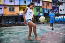 Por aquellos años hubo días en los que dormía abrazada a la pelota. Tan intenso era su sueño, que no podía desprenderse ni un solo momento del olor del cuero, ni de las costuras deshilachadas de su balón, que parecían bocas. Pero el balón resistía mil batallas, mil recreos y tardes de deberes sin hacer. Ella era un delfín entre las piernas de los muchachos, dos piernecitas chicas que más que patear, acariciaban el esférico, lo manejaban con sutil gracia, con una especie de salto, trote, distinción. No hay presente más absoluto que la jugada y la tarde por delante sin la presión de los padres y el colegio. Solo sonrisas y patadas, solo Menina da Rua y sus amigos.